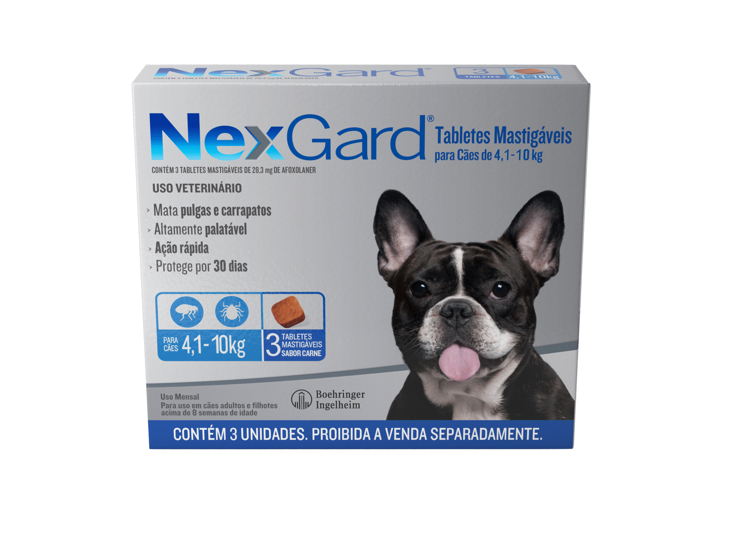 NexGard é um tablete mastigável, altamente palatável com sabor de carne, que mata pulgas e carrapatos com ação rápida, protegendo os cães a partir de 6 horas e oferece proteção por 30 dias. Conta com alta tecnologia de uma nova molécula de Afoxolaner, desenvolvida para oferecer uma excelente atividade ectoparasiticida.