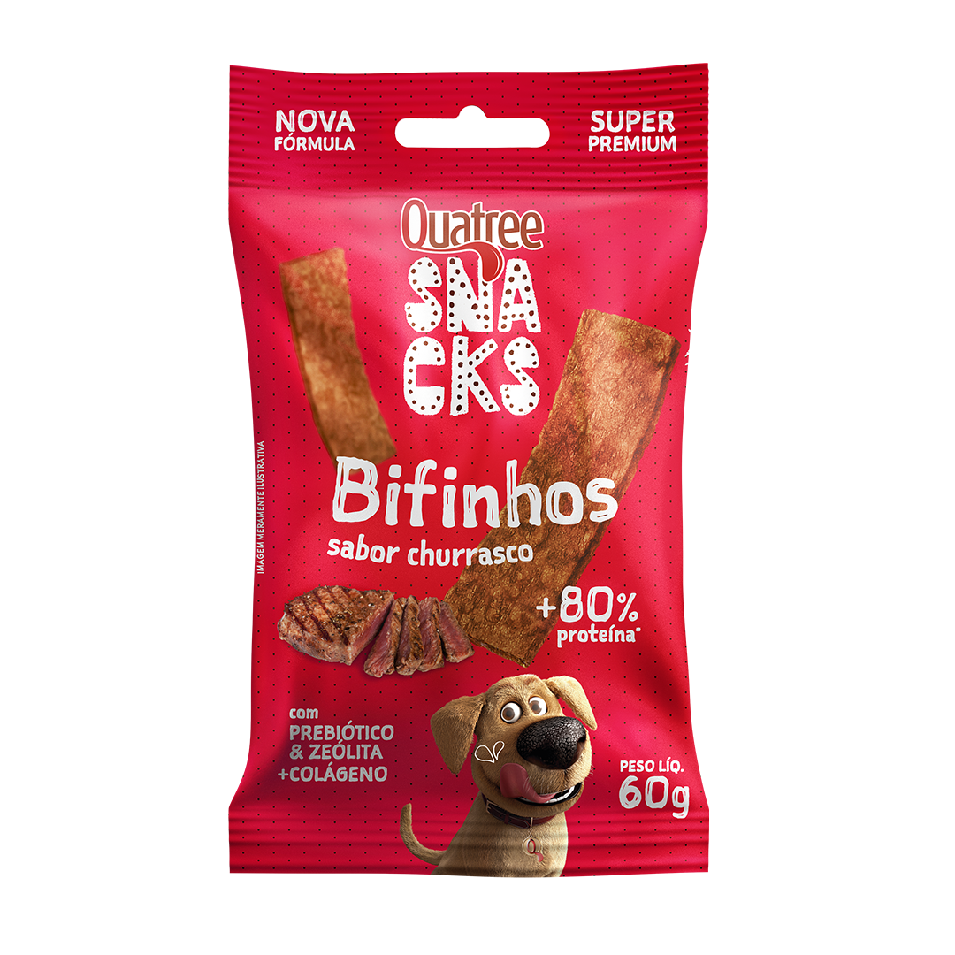 Quatree Snacks Bifinhos é uma delícia de petisco feito com ingredientes especiais que o seu cão vai adorar! Saboroso e nutritivo, é indicado para cães de todas as idades. Quatree Snacks Bifinhos contém prebiótico e zeólita para auxiliar no equilíbrio da flora intestinal, colágeno para manter a pele saudável e macia e hexametafosfato de sódio para reduzir a formação de tártaro e mau hálito. Quatree Snacks Bifinhos alimenta e faz a alegria do seu cão!